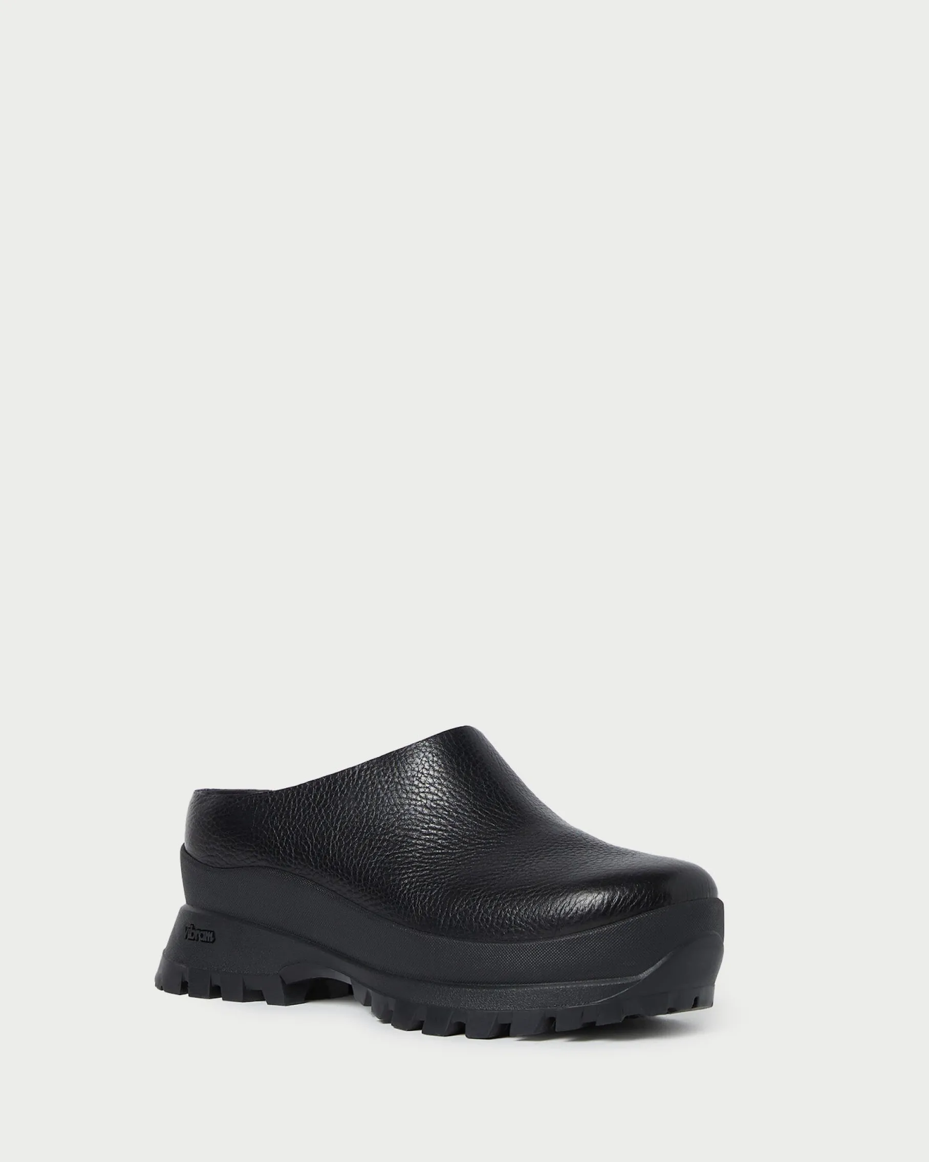 Welcome to Loeffler Randall. Discover our collection of beautiful, handcrafted styles from shoes to RTW to accessories. |Mule in black pebbled leather. Features a padded leather footbed with gold stamped logo, a lug sole, and a rounded toe. 1-inch heel.|Avoid prolonged exposure to water. Use a leather conditioner to maintain appearance.|Mule in black pebbled leather. Features a padded leather footbed with gold stamped logo, a lug sole, and a rounded toe. 1-inch heel.